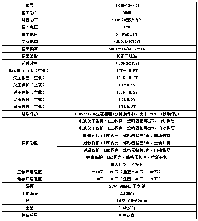 修正弦波300W 產品特點: 轉換效率高、啟動快; 修正弦波輸出; 軟起動功能; 負載適應性與穩定性強; 提供過流及短路保護,避免電器損壞; 溫度與功率共同控制風扇,安全高效; 內置保險絲,安全可靠。 直流電壓可定制:36V,72V,96V,110V等;交流電壓可定制120V,200V等;可定制各個國家插座。